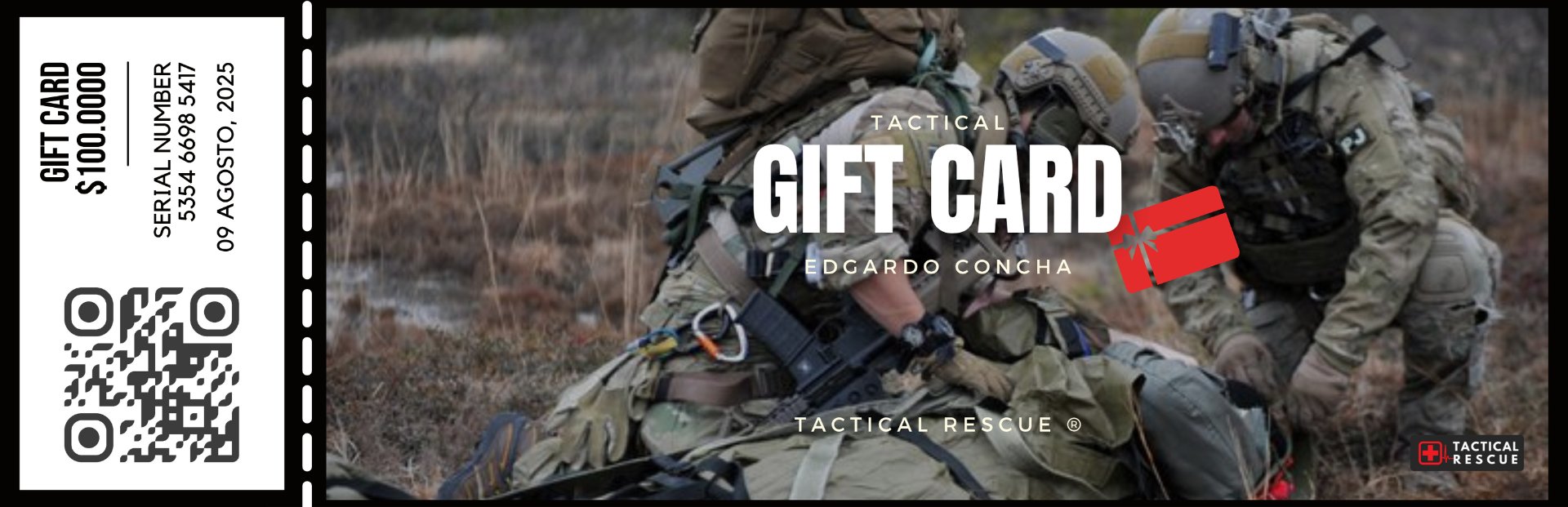 Al comprar una Gift Card, recibirás un código único que podrá ser canjeado en nuestros cursos o productos seleccionados de Tactical Rescue. Es una forma simple, rápida y significativa de apoyar a quienes buscan estar mejor preparados ante emergencias o entornos exigentes.