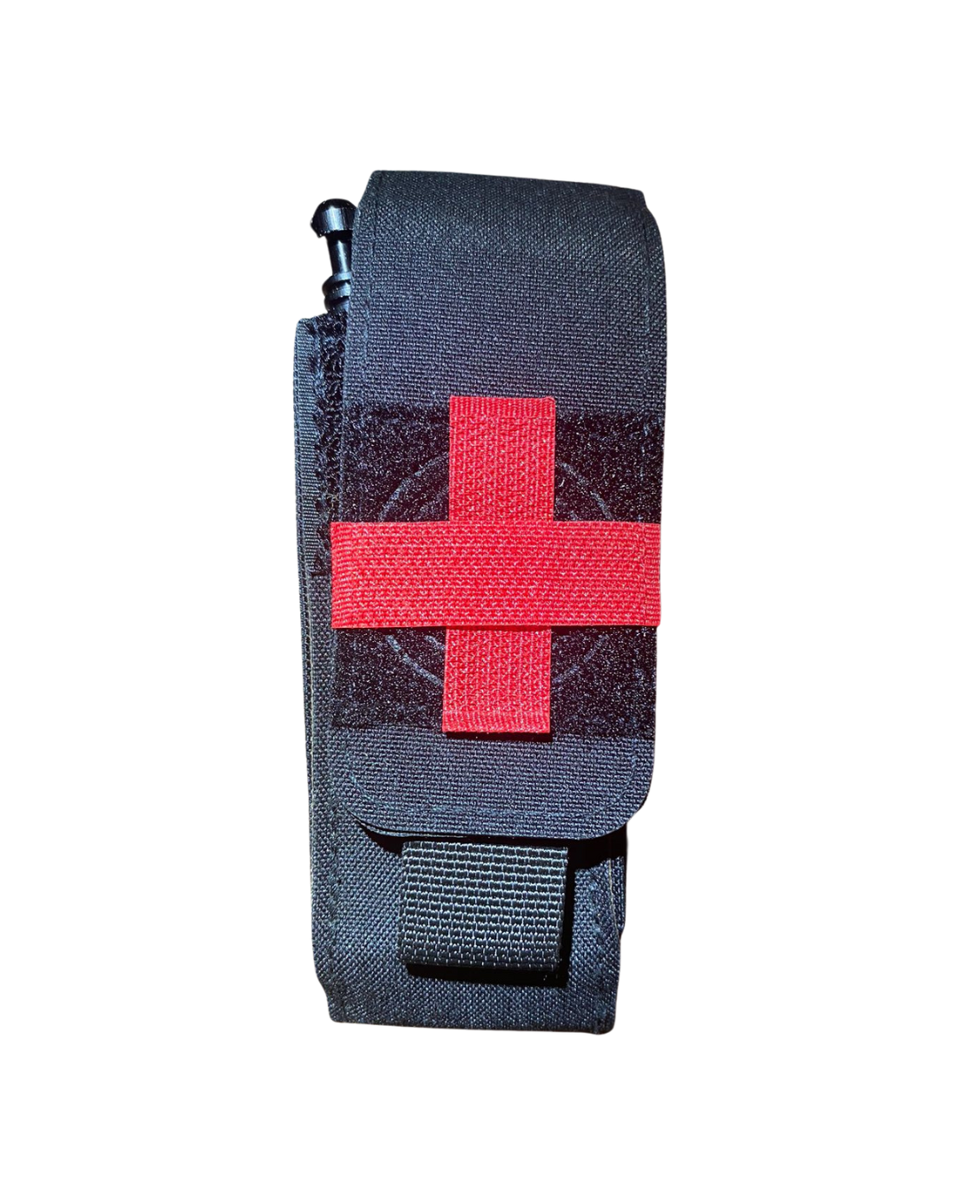 Incluye velcro frontal con cruz roja identificatoria, facilitando su reconocimiento inmediato como elemento médico. Su diseño ajustado y perfil delgado evita enganches y mantiene el torniquete protegido del polvo y la humedad.