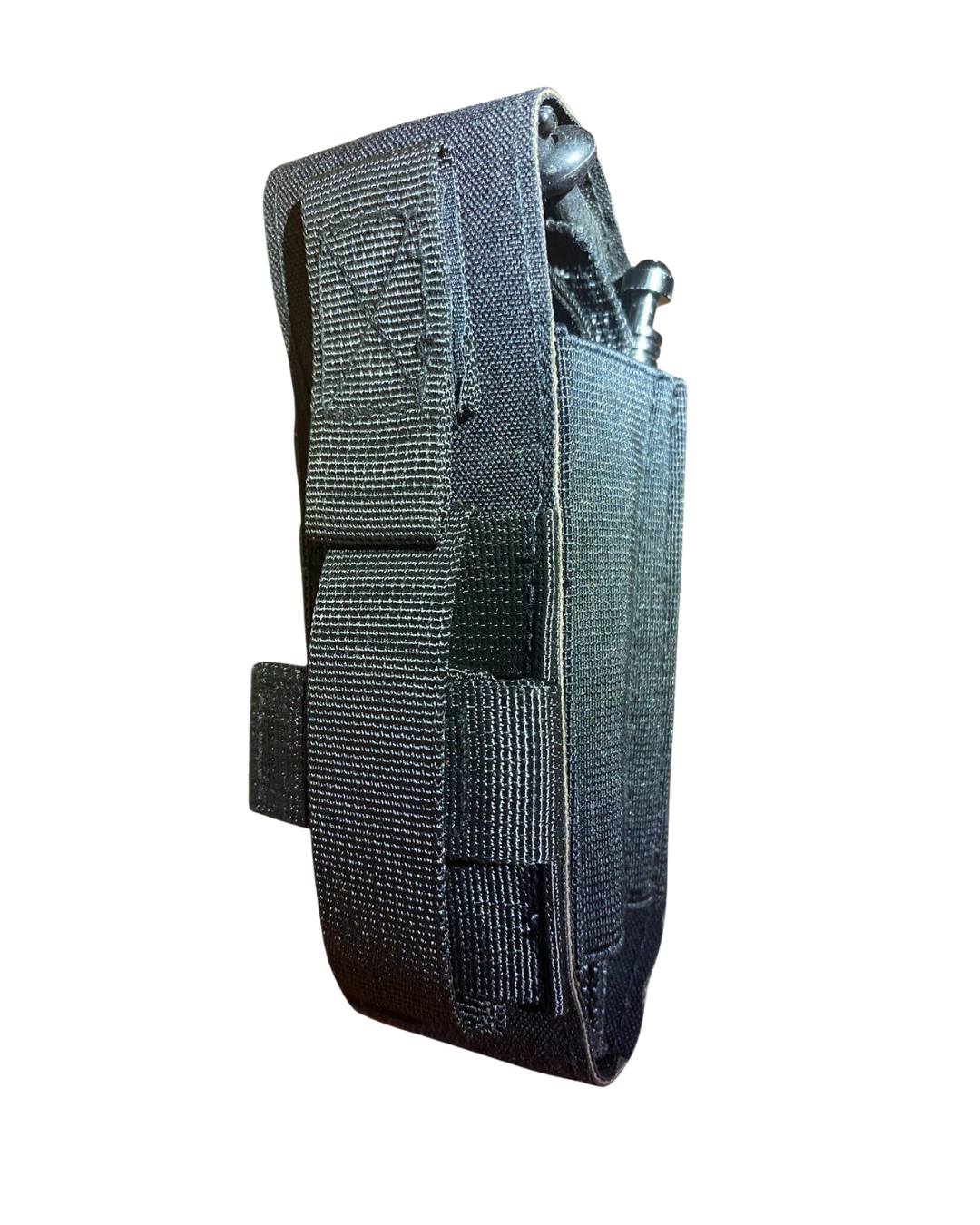 Fabricado en nylon de alta resistencia, ofrece una retención firme y compatibilidad con sistemas MOLLE, permitiendo su montaje en chalecos, cinturones o mochilas tácticas.